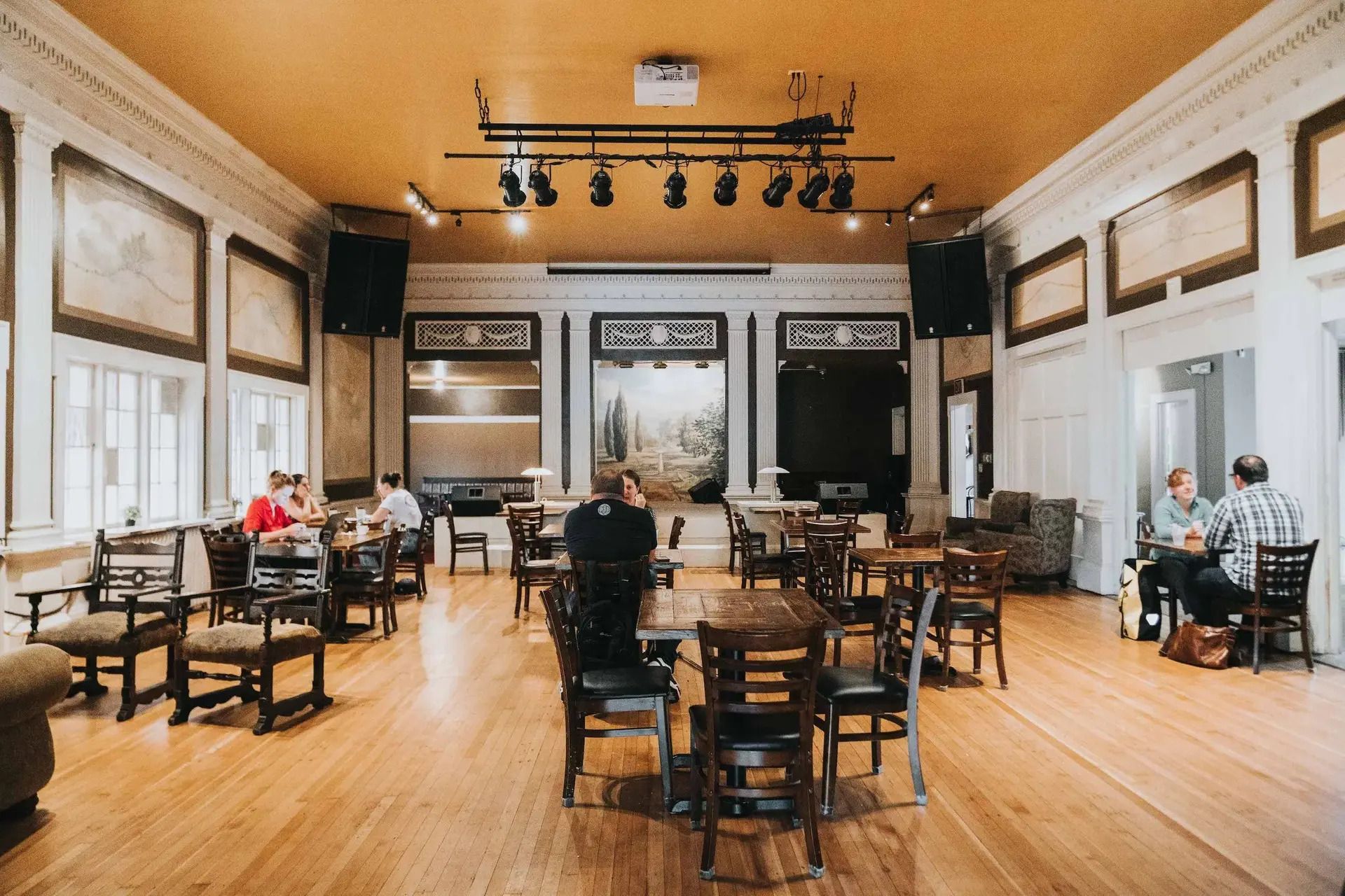 The Ballroom - The showstopper with original murals, natural light, projector, stage, and sound system. Seats 90, stands 150. Perfect for company parties or big celebrations.